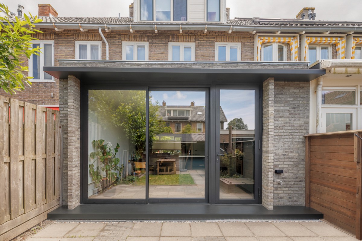 Aan de tuinzijde is een uitbreiding gerealiseerd met de keuken en een flexibele werkplek. Een op maat ontworpen eikenhouten kozijn verbindt deze ruimtes direct met de tuin en versterkt de relatie tussen binnen en buiten.