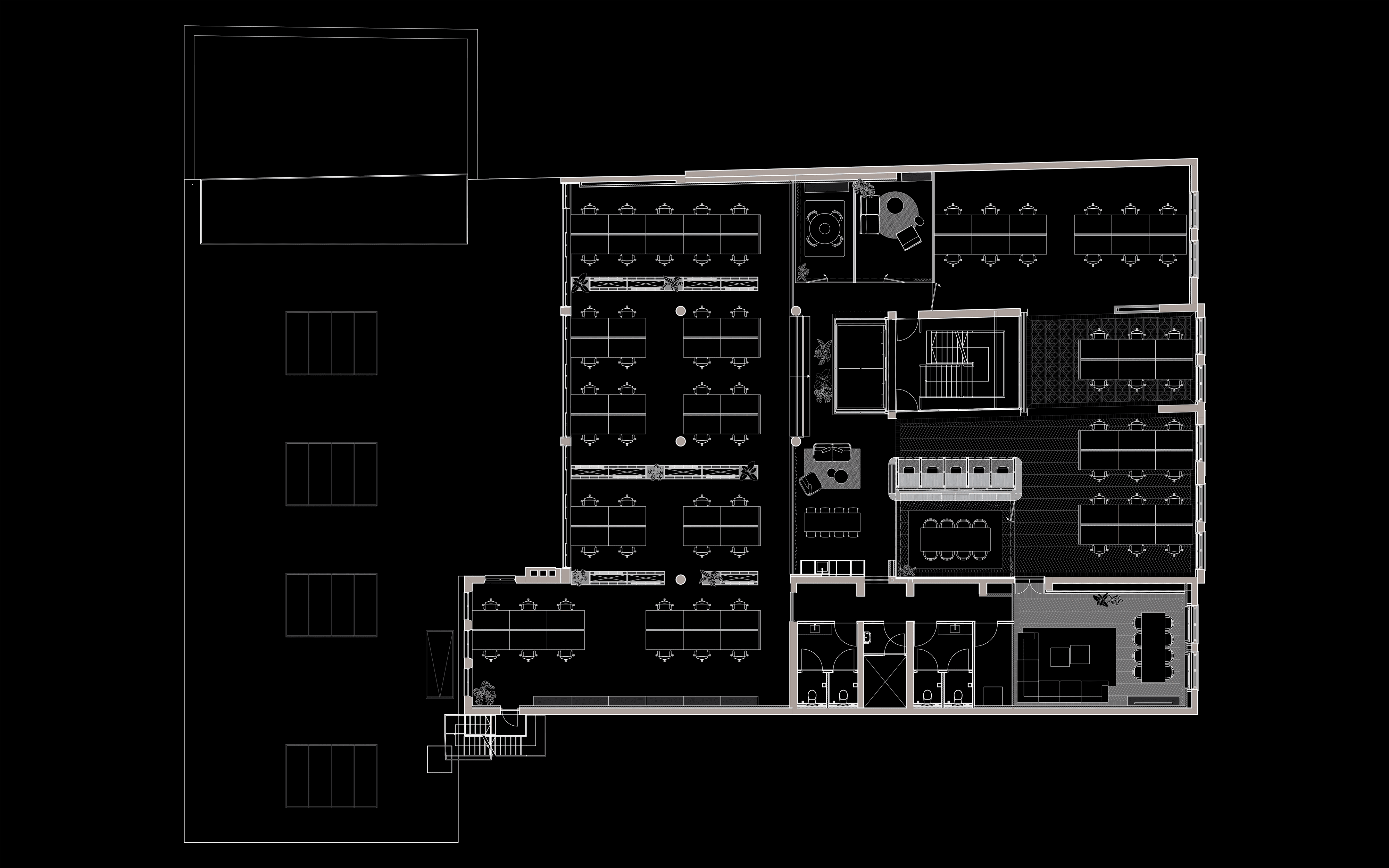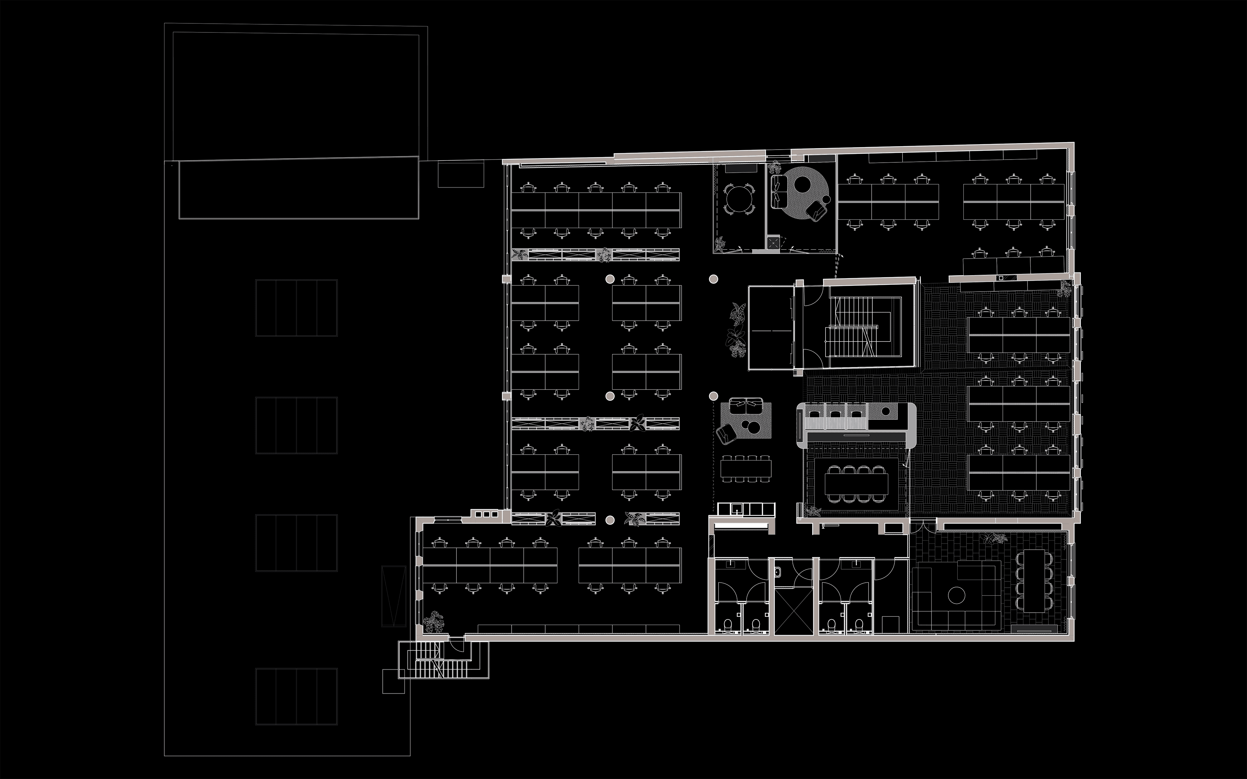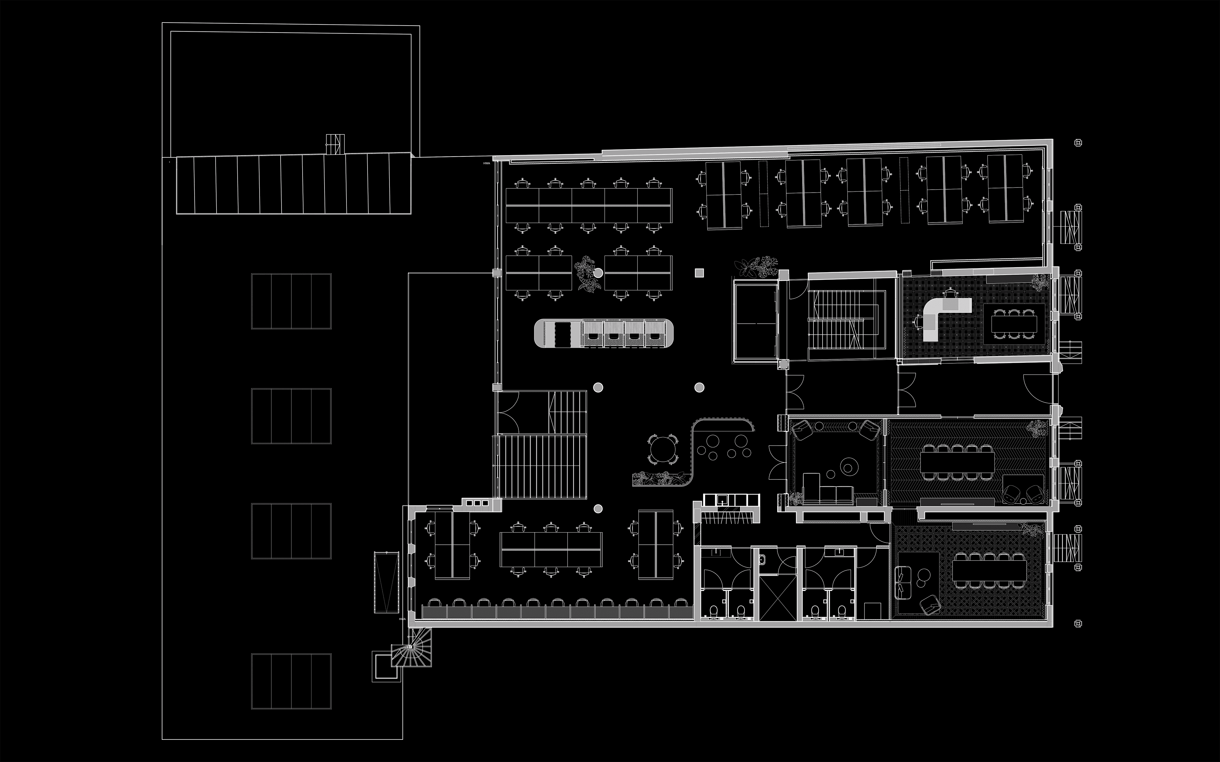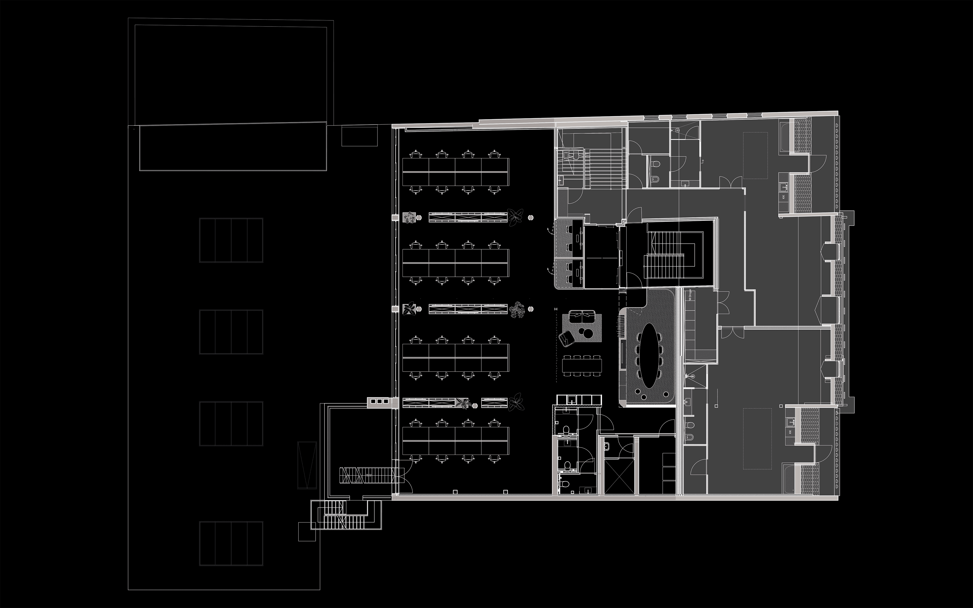 Een grondige analyse van de organisatie en de lay-out van het gebouw lag ten grondslag aan het ontwerp van de verticale indeling op basis van interactie en geluidsniveaus. Van de levendige Founders Club (zie project) in het souterrain tot aan het stille IT-team op de derde verdieping. Om alle open ruimtes werkbaar te houden, ontwierpen we Room Dividers (zie kader) die de verschillende werkteams afbakenen en tevens fungeren als kast-, whiteboard- en prikbordelementen. Daarnaast creëerden we belbooths, duo-booths en 1-op-1 ruimtes met afgeronde vormen en akoestische afwerkingvoor rust en privacy.