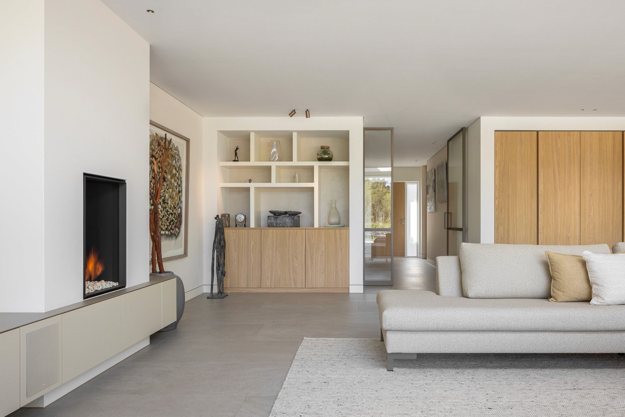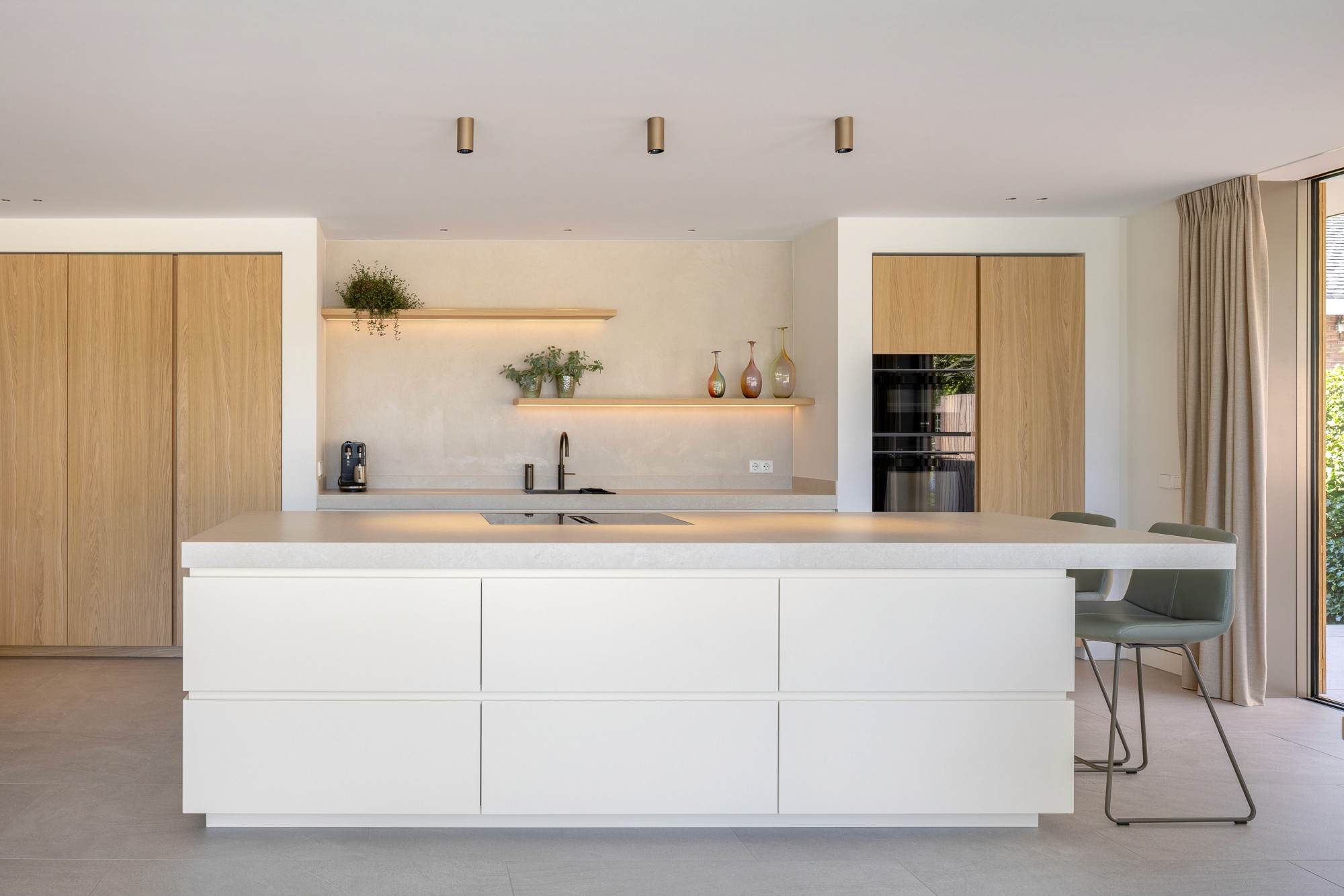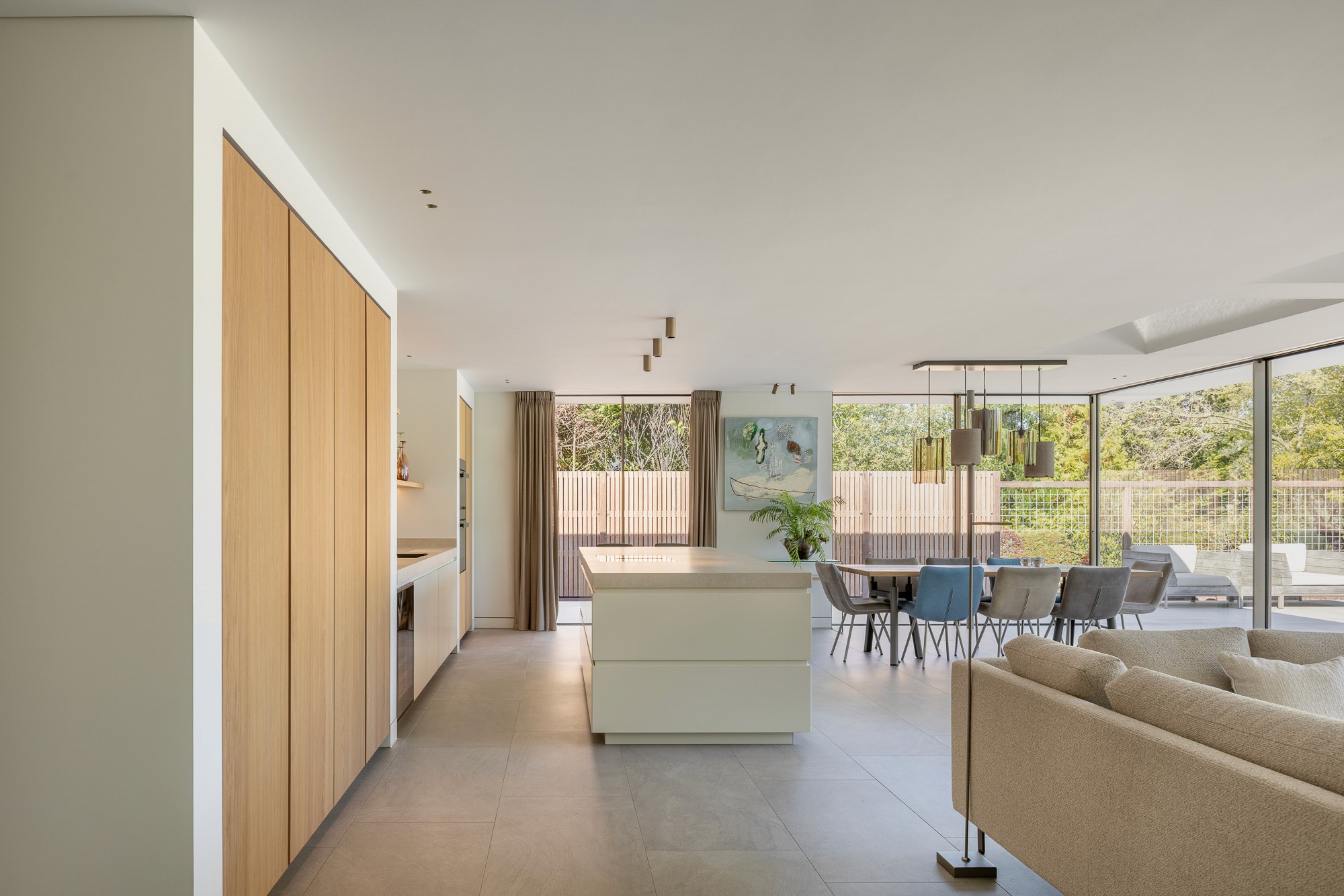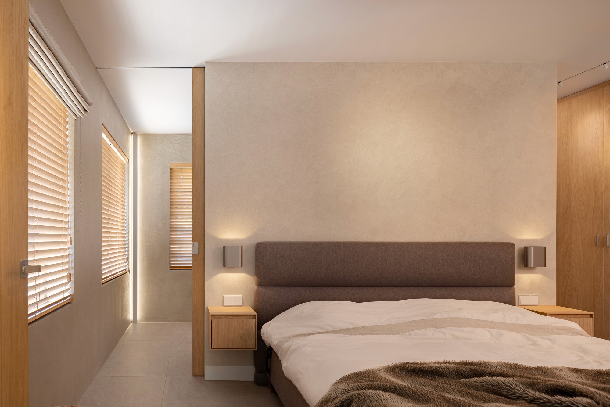 Aan de overzijde ligt de master bedroom, voorzien van een royale maatwerkgarderobe en en-suite badkamer. Hier is gekozen voor een zacht materialenpalet met beige vloeren en bijpassende wandtegels. Het maatwerk, evenals de Xinnix-deuren, is uitgevoerd in eiken, waardoor warmte en tactiliteit centraal staan. Het keukeneiland is afgewerkt in zachtgeel gespoten MDF en de wit-eiken plinten zijn terugliggend geplaatst zodat de wandlijnen extra krachtig worden. De stalen kolommen in de woonkamer zijn gecoat in een tint die aansluit bij de geanodiseerde aluminium puien.