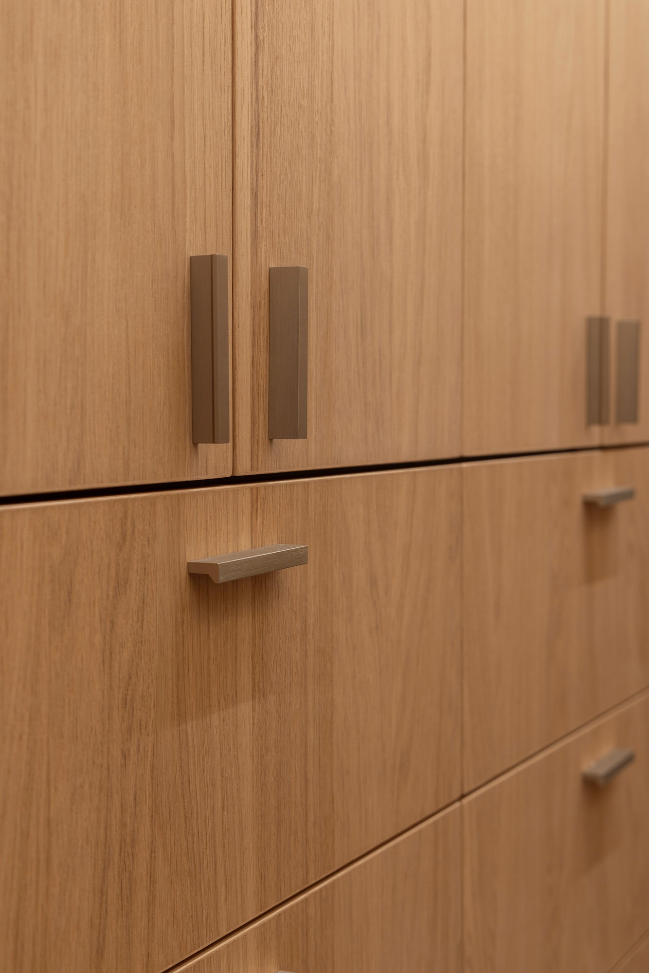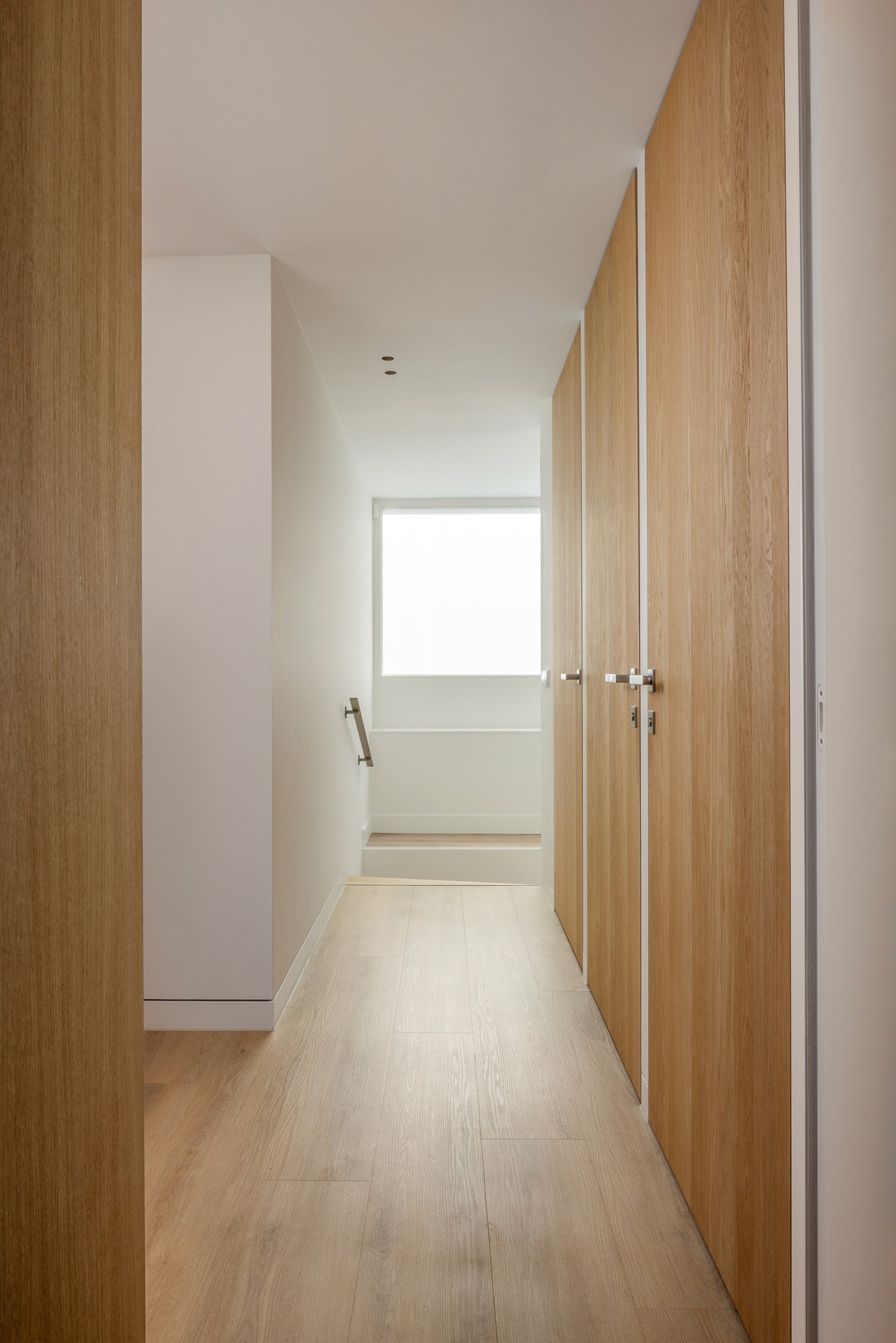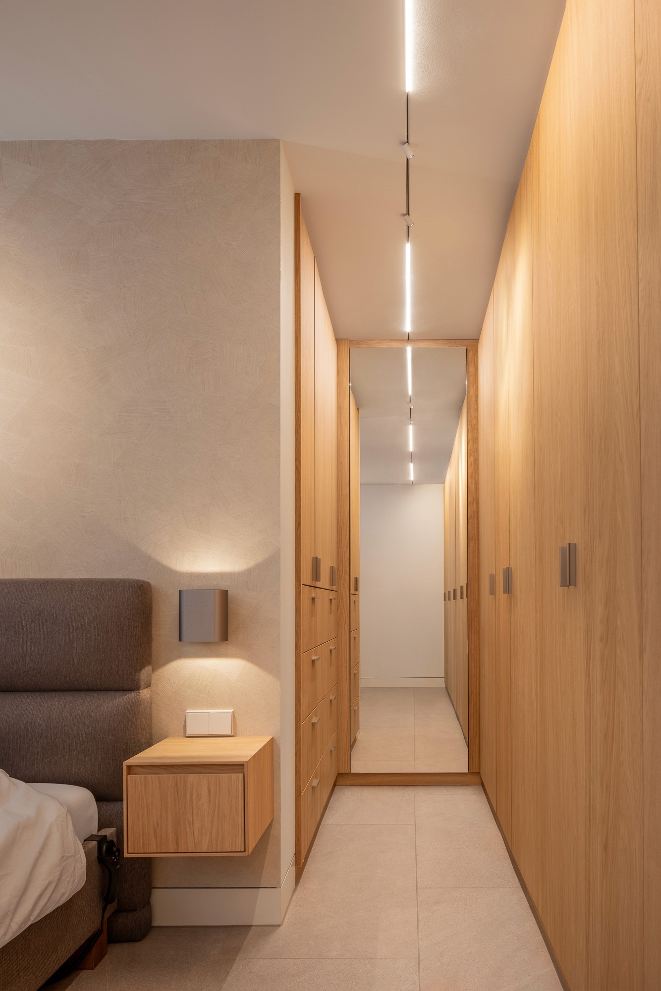 Aan de overzijde ligt de master bedroom, voorzien van een royale maatwerkgarderobe en en-suite badkamer. Hier is gekozen voor een zacht materialenpalet met beige vloeren en bijpassende wandtegels. Het maatwerk, evenals de Xinnix-deuren, is uitgevoerd in eiken, waardoor warmte en tactiliteit centraal staan. Het keukeneiland is afgewerkt in zachtgeel gespoten MDF en de wit-eiken plinten zijn terugliggend geplaatst zodat de wandlijnen extra krachtig worden. De stalen kolommen in de woonkamer zijn gecoat in een tint die aansluit bij de geanodiseerde aluminium puien.