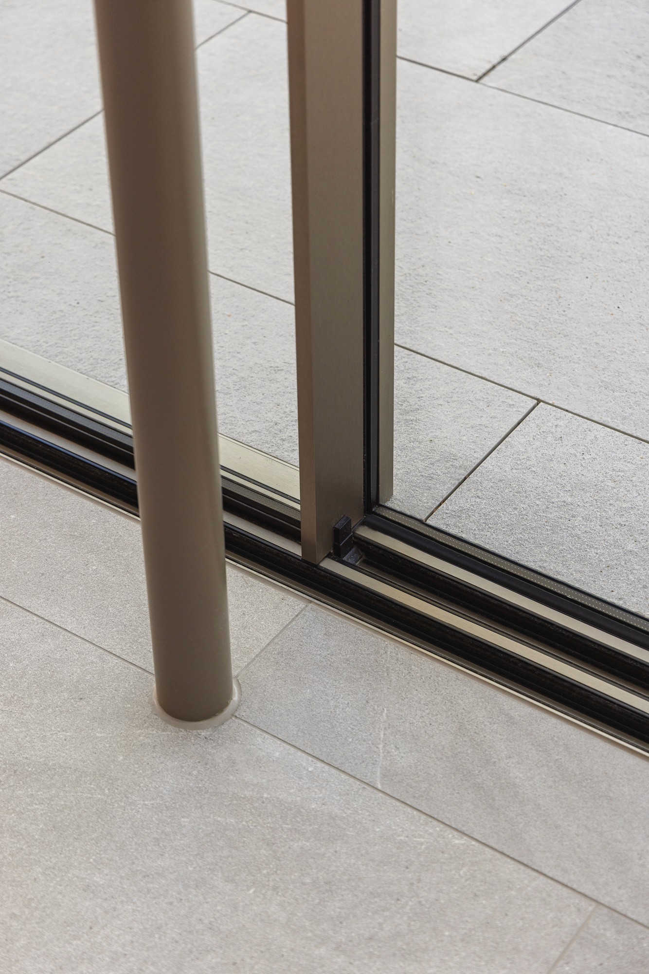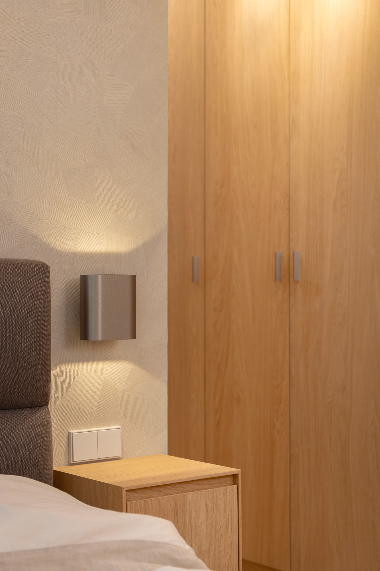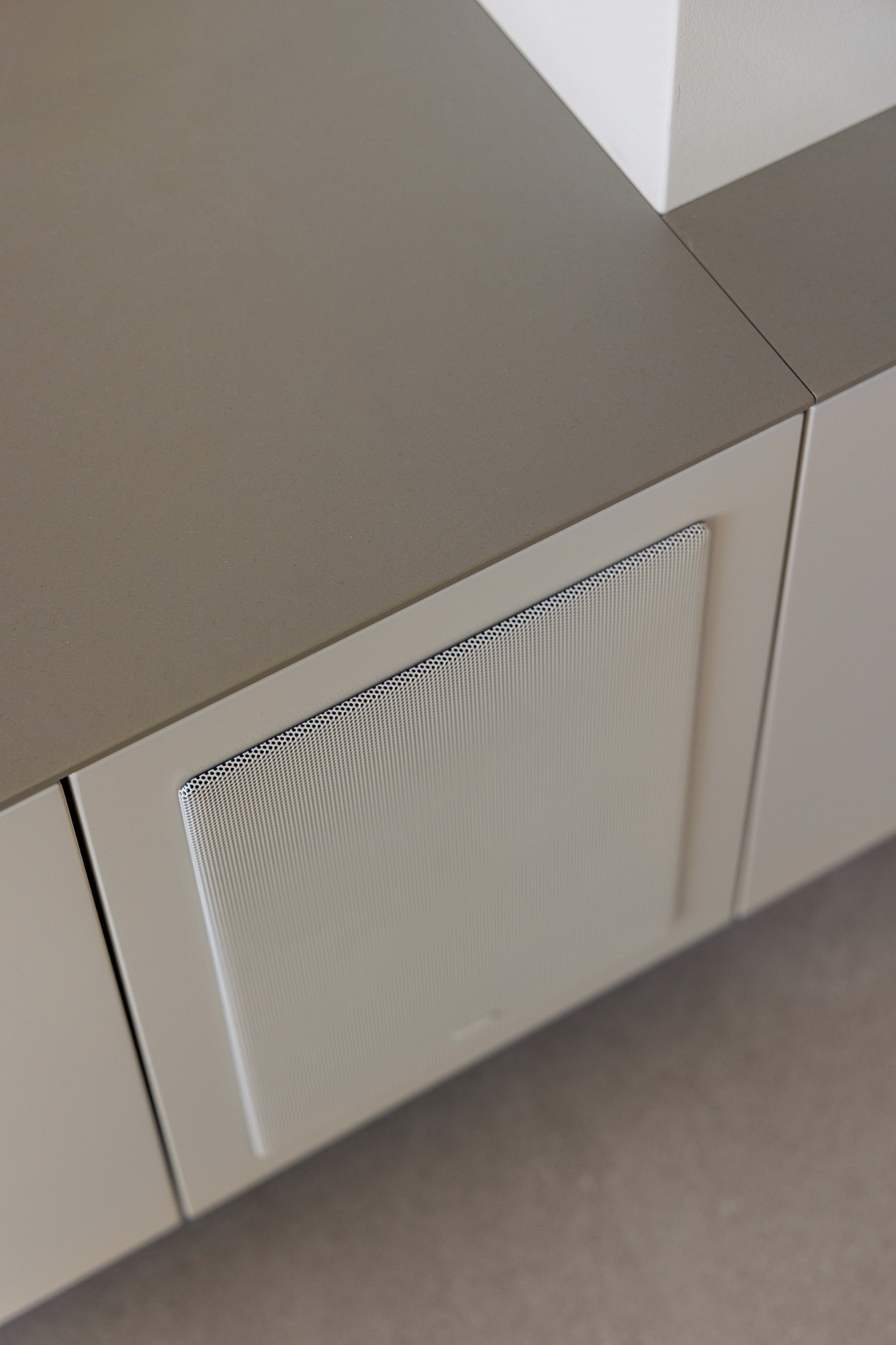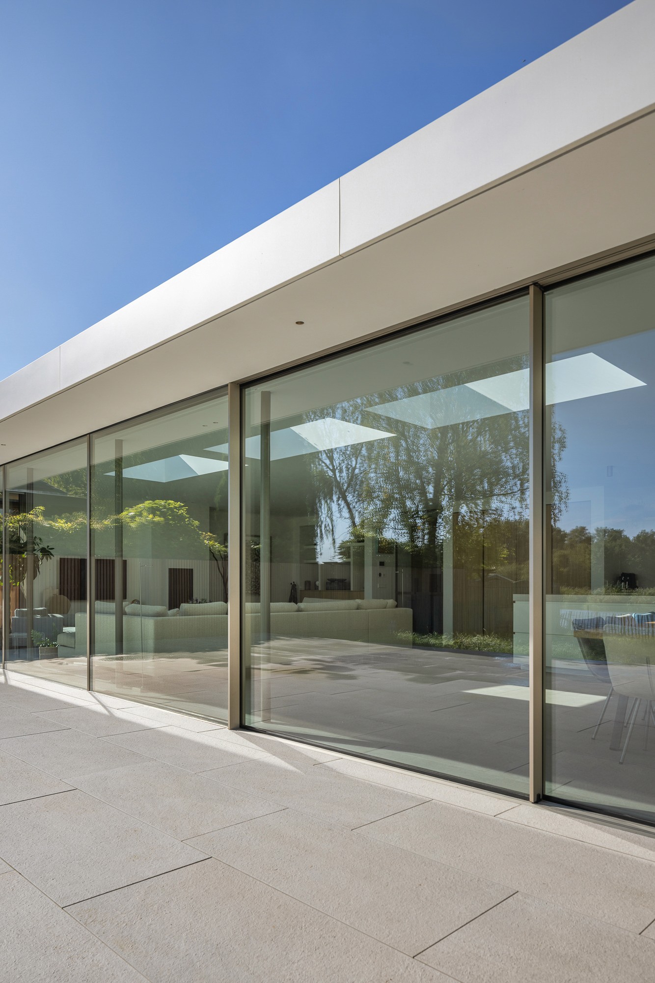Aan de overzijde ligt de master bedroom, voorzien van een royale maatwerkgarderobe en en-suite badkamer. Hier is gekozen voor een zacht materialenpalet met beige vloeren en bijpassende wandtegels. Het maatwerk, evenals de Xinnix-deuren, is uitgevoerd in eiken, waardoor warmte en tactiliteit centraal staan. Het keukeneiland is afgewerkt in zachtgeel gespoten MDF en de wit-eiken plinten zijn terugliggend geplaatst zodat de wandlijnen extra krachtig worden. De stalen kolommen in de woonkamer zijn gecoat in een tint die aansluit bij de geanodiseerde aluminium puien.