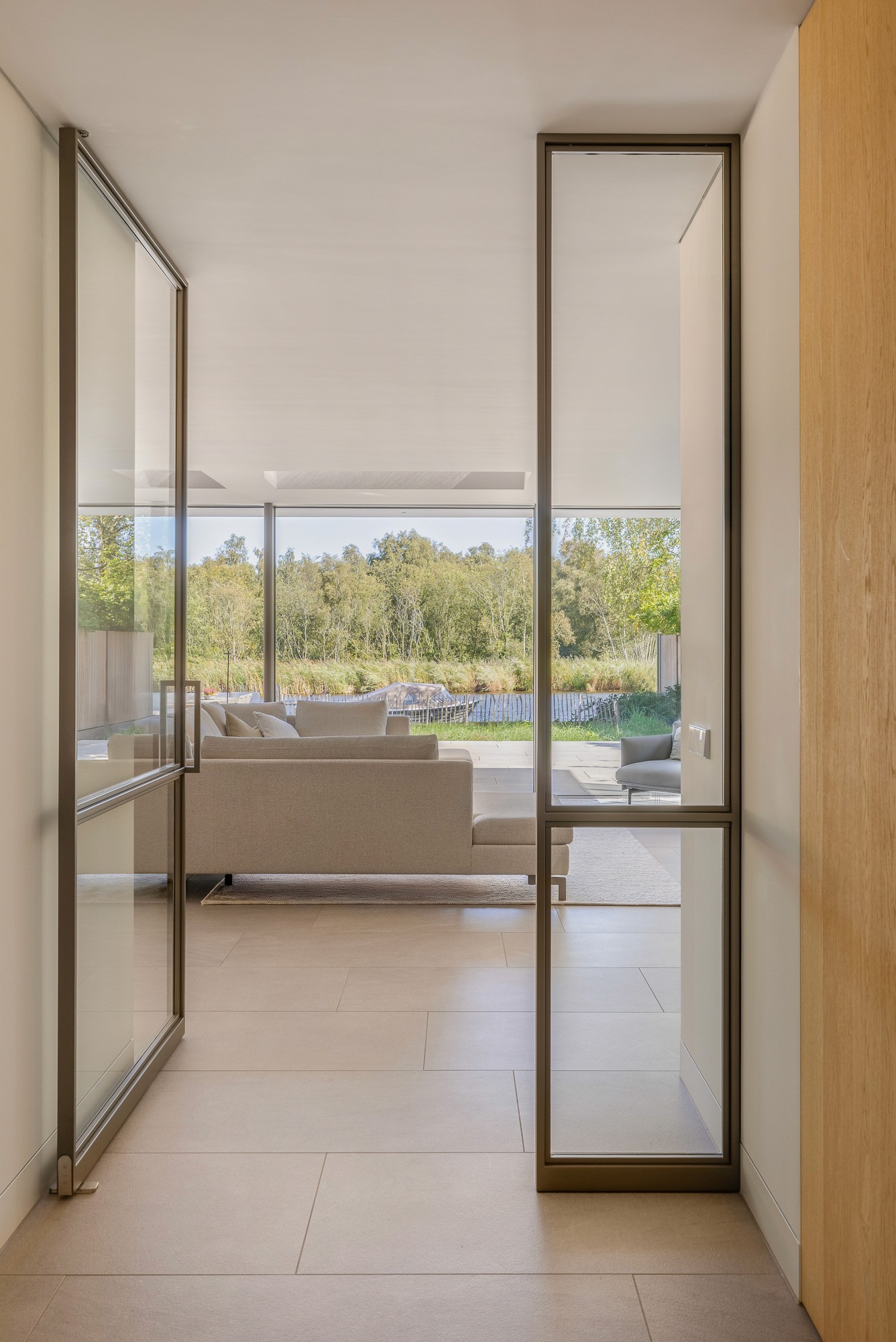 Naast de leefruimte is ook de gehele entreezone opnieuw ingericht. Bij binnenkomst leidt een nieuwe trap op een efficiëntere plek naar de eerste verdieping. De trap verdwijnt deels achter een nieuwe garderobe en ruim gastentoilet en wordt visueel onderbroken door een maatwerk stalen pui richting de leefruimte.