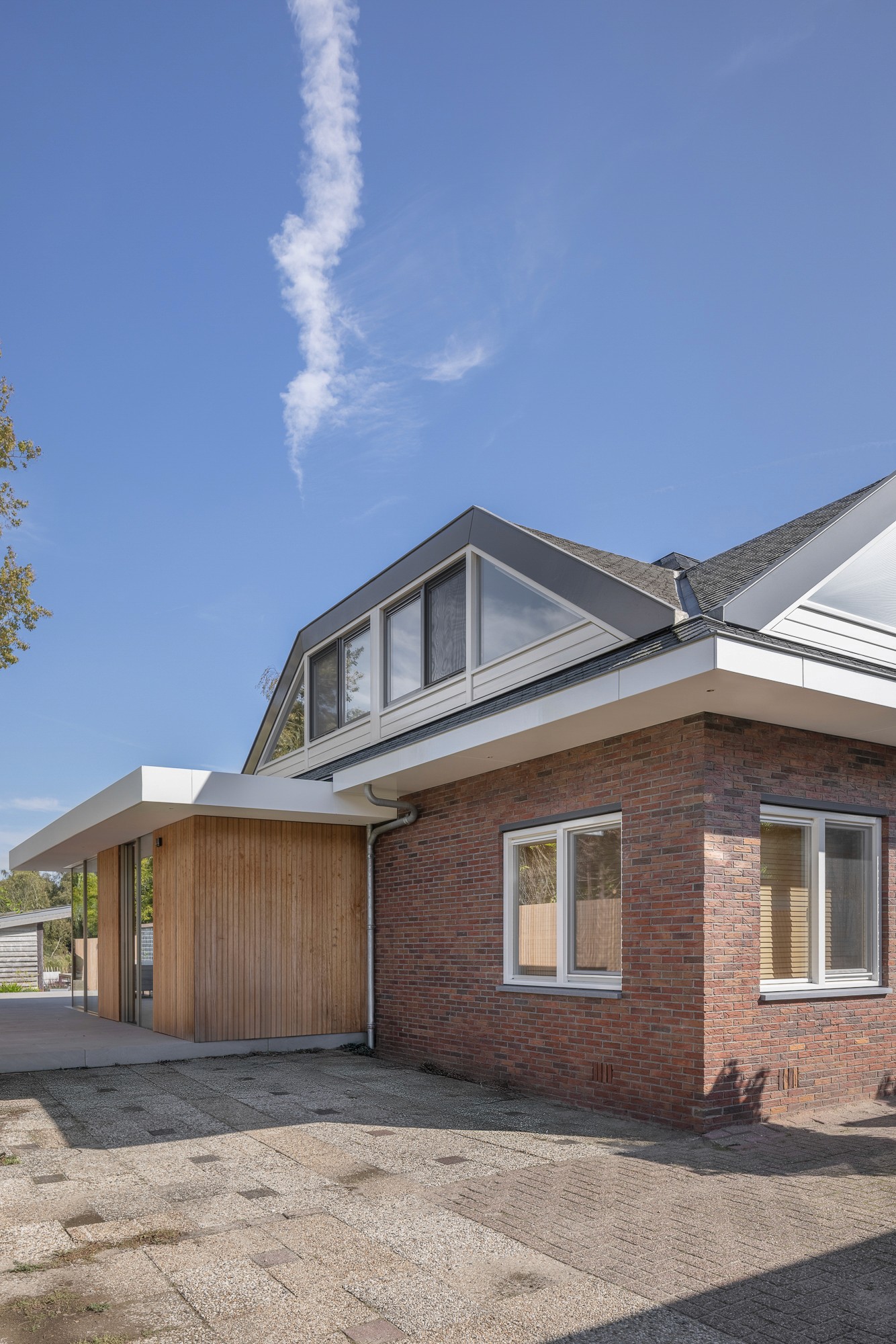 De gevel van de aanbouw bestaat uit verticale, thermisch gemodificeerde houten delen die strak zijn ingeklemd tussen vloer en plafond. Deze houten accenten keren terug in het bestaande deel van de woning en vormen onder andere de nieuwe voordeur en garagedeur waardoor oud en nieuw harmonieus één geheel vormen.