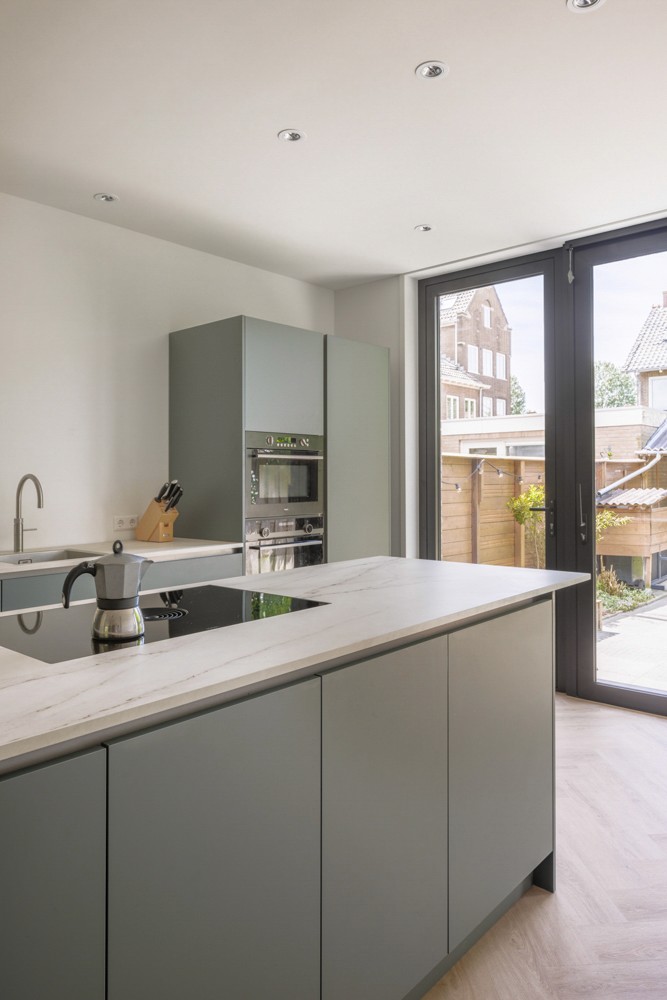 De keuken zelf staat in het verlengde van deze routing met het kookeiland als centraal element. Door deze opzet is het mogelijk geworden om de eettafel parallel aan het kookeiland te plaatsen waardoor de leefkeuken helemaal richting het licht en tuin is georiënteerd.